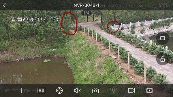 事发后,韩家新装了监控摄像头,韩伟在截图上标注了案发地点。左为停车处,右为其所称投不明液体处。