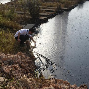 6月9日,钦州钦南区一家土法炼铝企业正在生产,厂区蓄积大面积刺鼻废水,通过管道外拍河流。图为督察人员正取样检测。本文图均为澎湃新闻记者 刁凡超 图