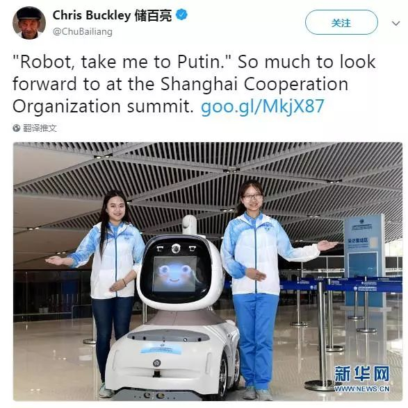 《纽约时报》记者克里斯·巴克利(Chris Buckley)在个人推特上转发了一张青岛峰会新闻中心机器人的照片,并表示“十分期待青岛峰会”。