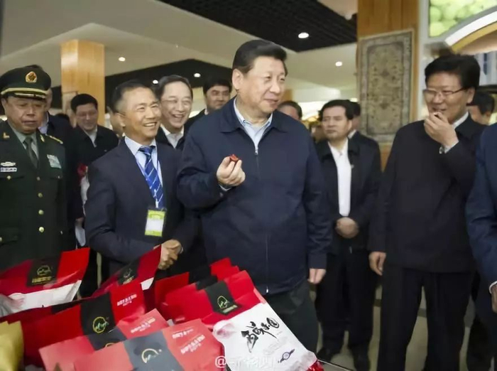 2014年4月28日下午,习近平来到位于乌鲁木齐的新疆果业集团有限公司。展厅内干果产品琳琅满目,总书记边听介绍边应邀品尝,称赞树上干杏“别有风味”、若羌枣“味道好”。他说:“新疆有烤馕、抓饭、羊肉串、哈密瓜、葡萄等,咱们有充足的理由说,‘不辞长作新疆人’。”