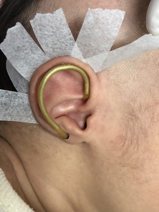 倪玉苏介绍,有先天性耳廓畸形的新生儿,出生时一只或两只耳朵发育不全,常常“缩成一团”。简单的耳畸形可以通过这种自制矫正器矫正,复杂的耳廓畸形需要使用earwell矫正器矫正,比起成年后再进行矫正手术,早期干预保守治疗大部分可以获得较好的疗效。