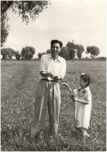 1958年,李庄与小女儿东东在莫斯科郊外集体农庄的田野上采花。