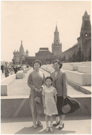 1958年,母亲赵培蓝(右一)与同事唐群芳带李东东参观莫斯科红场。背景是列宁墓(中)和克里姆林宫(右)。