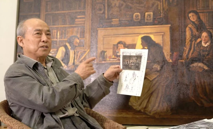 在创作过程中所作的一切调整,一个是为了构图内在的结构需要,另一个是要展示空间的真实感,包括《马克思画传》中虽然提供了这样一个环境资料,但是并没有告诉我,茶几上还会摆设些什么。如时钟、台灯等,我都必须找到依据。这些依据都是在十九世纪法国、德国的一些写实主义画家的画册里找到的。那个时候有电灯吗?没有,但是有汽油灯和蜡烛,那些器具,如烛台,煤油灯罩,是什么样子?因此,在画历史题材的绘画时,画家首先不是我个人能够以什么样的技巧来显示我的技巧,为所欲为地凭空编造,而是以诚实的态度去考证画面里的任何一个细节,考虑能以什么样的形式和表现手法,最贴切地揭示当时的真实情景。我有画过外光人物和环境的绘画经验,但是没有画过灯光下的环境,尤其是烛光中的物象空间。当我选择了这样一个瞬间的时候,我意识到:这对我自己是一次挑战,我需要学习、需要尝试,对我来说是一些陌生的表现手法。