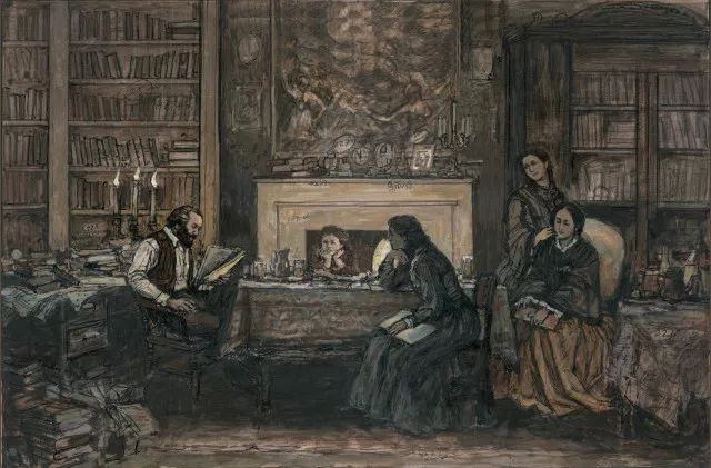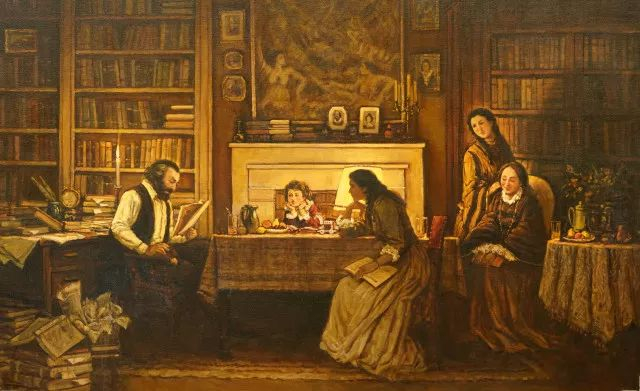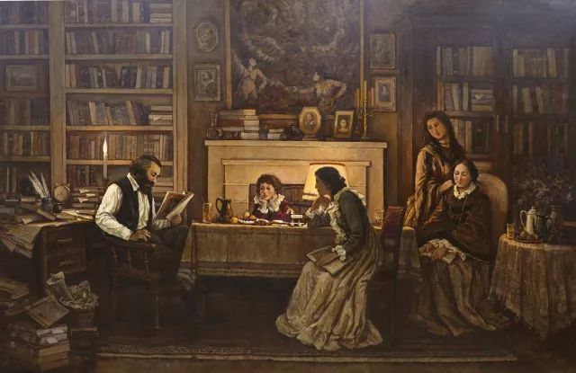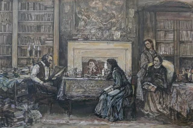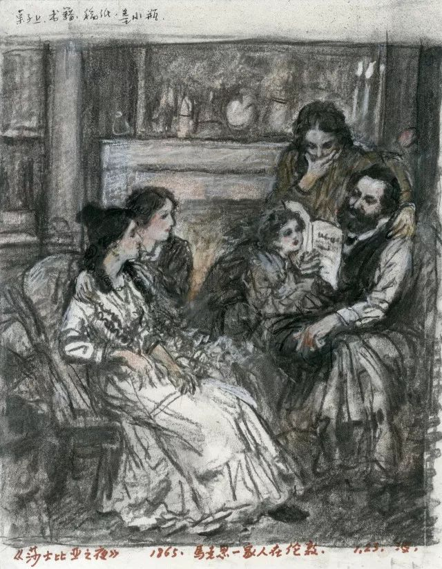 我想象:这是1865年秋冬之际的一个初夜,在马克思伦敦的住所——书房兼起居室中,书架、书柜、写字台乃至地面都摆满了书籍和马克思写作的手稿——这是一个学者之家、一个安详、宁静的夜晚,马克思放下了他白天写作的稿件,同家人在一起阅读他们喜爱的作品,画面充满了诗意的、浪漫的氛围。时钟表示在八、九点之间,他倡议的一个家庭的诗歌朗诵会开始了。在烛光下,壁炉前,壁炉上安放着莎士比亚的肖像。我设定:这或许又是一次莎士比亚的诗歌朗诵会,因为他们全家都特别喜欢莎士比亚的文学和戏剧——这该是一个享受莎士比亚美好诗意的夜晚。劳拉依偎在母亲燕妮身旁,小燕妮坐在桌前出神地凝视着父亲的表情,不满八岁的小女儿艾琳娜,看着爸爸动情的样子,眼神里充满了喜悦和好奇。此刻,马克思自己也沉浸在诗意之中,他的手指伴随着朗读的节奏,下意识地在坐椅的扶手上敲打着节拍。全家人都陶醉在诗意的畅想之中了。这是我把题目定为《马克思和家人的莎士比亚之夜》的缘起。