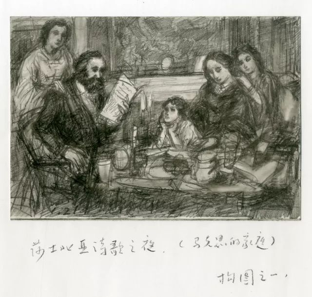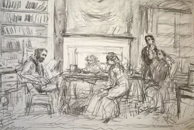 我没有预料到,虽然此后我又作了四个不同角度、不同人物关系的草图。而这段改动构图的反复过程,对我而言比较艰难。我总希望:有一个感觉更贴切构思的画面,所以虽然有了第一个稿子,我脑海中还会不断地出现另一些场面,以及不同的人物组合的关系。总是不断在琢磨,会不会有更理想的构图?比如说,我把画面环境再缩小一点,让一家人都围拢在马克思的身旁?(图8)或在壁炉的前面?(图9)让马克思坐在他的写字台前,让燕妮和女儿们和他更贴近些?(图10)这是不是可能显得很亲切些?或者变成一个竖起来的构图?让人物之间的关系更紧凑些?