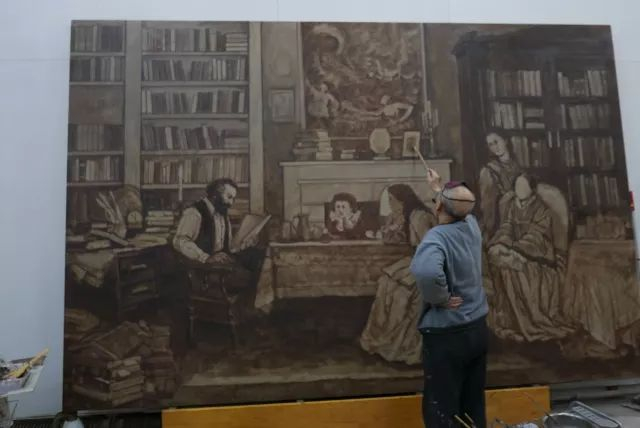 在画的过程当中,光线由明及暗,哪里对比强一点?哪里对比弱一点?影子是怎么一点点消失的?这些都是我作画时要考虑的问题。一幅2.5米×3.8米的油画,应该说在我的绘画经历当中不算是大画,因为我是画壁画的。但是,作为架上油画作品来讲,它的确也算是一件篇幅较大的作品。篇幅比较大的作品需要一些细节去充实,但又不能罗列细节,喧宾夺主。比如我画马克思书架上的这些书。这些书,应该都是马克思在不同时期买来的。在书架上,有横有竖,有不同的装潢设计。我在画这些书的时候,既要根据原始资料的启示,同时也要对它们进行重新的设计。这些书籍的设计,来自于我所大量翻阅的那个时代的画家们的绘画作品,因为那些画才是有色彩的。 而且,这些书籍必须给人感觉很具体,包括摆在地面上的这些书,不可作概念化的图解。