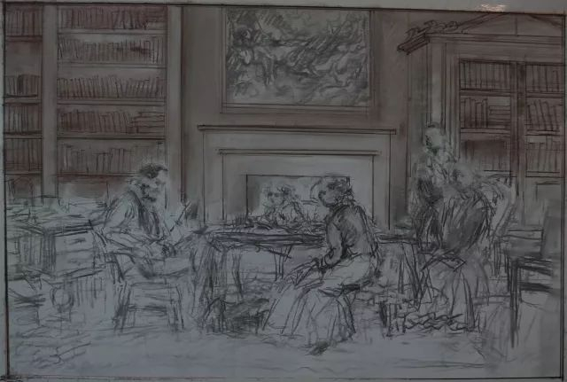 我从1月15号做第一个稿子,到2月28号完成这个素描稿(图20、21、22、23),几乎是用了一个半月的时间!最后,我还是感觉不对,于是请学生帮忙,在电脑上,帮我把这构图的的环境扩大、比例拉宽、书架升高,重新把人物的高矮、前后关系,包括壁炉的高度,作出适合感觉的改动和调整。(图24)很重要的原因是我手术后眼睛不舒服,画一会儿就感觉疲倦,甚至看不清我画的这些东西,导致这个稿子做得比较艰难。其实,画不在乎大小,我常年作壁画,原本具有一种驾驭大型绘画的经验,但我清醒的知道,如果小构图上做不好,上正稿时就会有大的反复,无疑会事倍功半。但我在这个小稿子上倾注的时间,包括之前构思也都超出了我已有的经验。