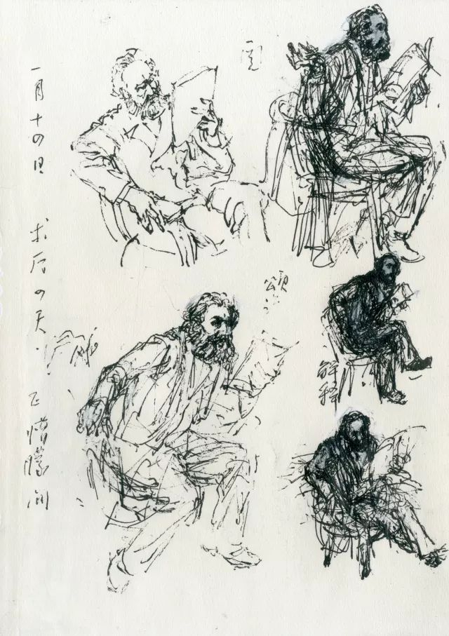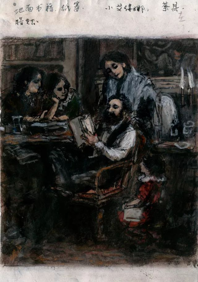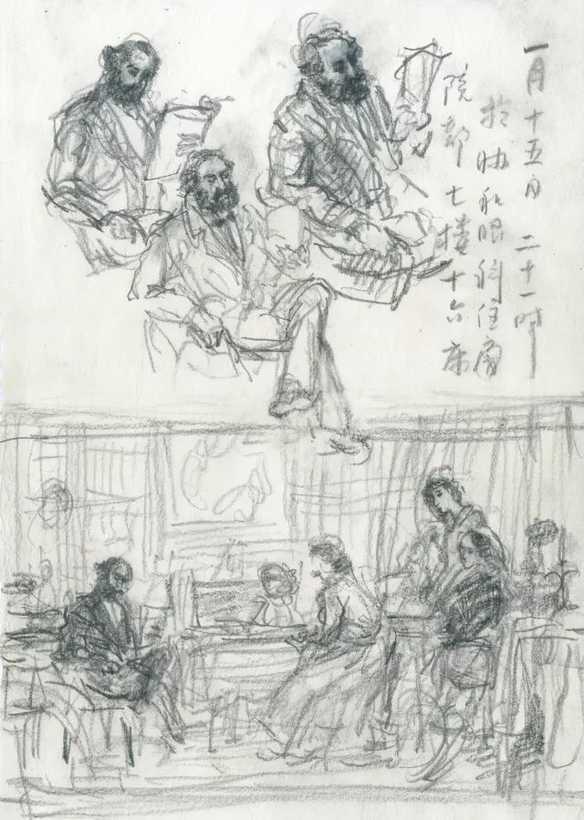 我这一代人,学画的时候,自己没有照相机;即便有,也舍不得费胶卷。平时收集素材,主要靠速写、素描写生的手段。在创作构图之前,我渐渐养成了一种习惯,即便有现成的图像资料,也还得通过自己的素描写生,或者临摹的过程画出来,甚至要反复地画若干遍,一直等到画中人物、人物情态、器物、环境可以转化为记忆的火候,才可能在构图中让画中人物、情态、情景,随心所欲地勾画出来。