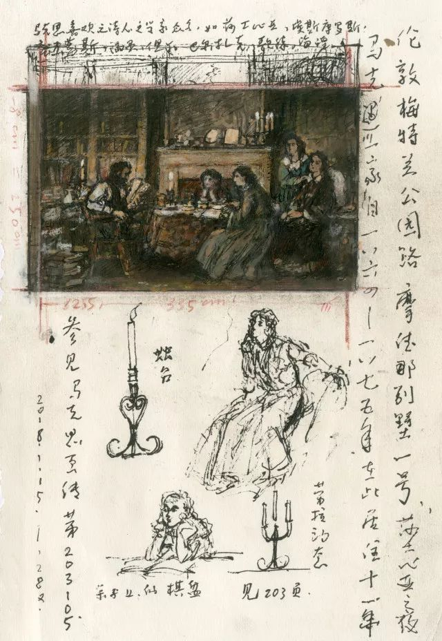 经过一番苦苦琢磨,我还是重新找回了1月15号开始做的第一个小构图(图18)——第一次的直觉,往往就是连结终点的最初灵感所在!这个环境更有一种学者之家的氛围,满房间都是书籍,而且这个可以作为背景环境的资料照片也非常详实。在那个巴掌大小的纸片上我有琢磨了一个星期,宏观的看,人物在画面中的比例比较适中。但进展非常慢,手术后的那段时间,我的眼睛有些障碍,正所谓:难能“应目存心”,更难“得心应手”。这个小构图我一直磨蹭到2月28号。