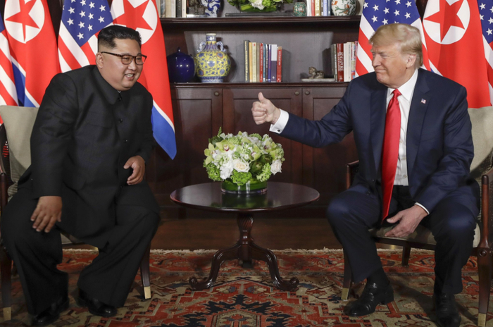 公开发言结束后,特朗普与金正恩再次握手后,向金正恩竖起了大拇指。