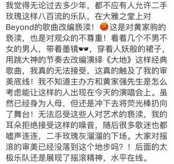 6月10日北京工体举办的“祝您愉快”纪念黄家驹25周年演唱会上,“二手玫瑰”乐队翻唱的《大地》和《不可一世》遭遇巨大嘘声。“亵渎”“不男不女”“人妖”“八百流乐队”“触及审美底线”等辣眼睛的表达从现场、直播弹幕涌到社交媒体。