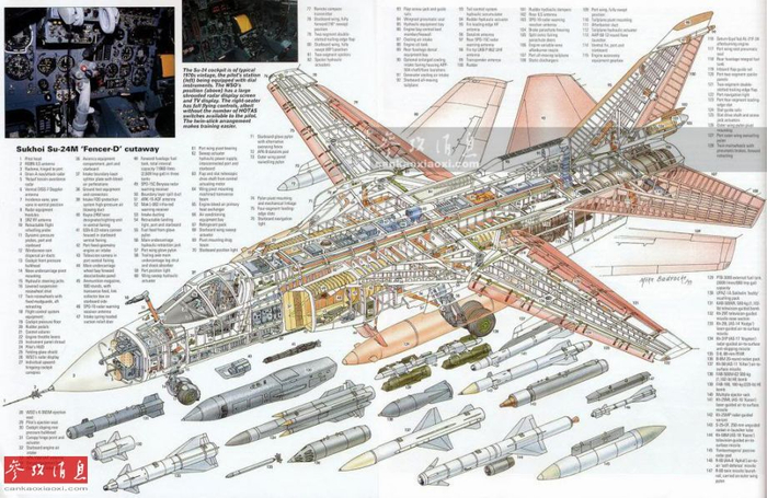 苏-24M(MP)全机长22.53米,最大翼展17.64米,最小翼展10.37米,机高6.19米,最大起飞重量43吨,最大平飞速度1.35马赫。最大作战半径615千米。图为苏-24M战斗轰炸机的彩色剖面图。