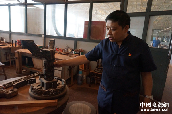刘更生介绍“一木连做”的传统工艺。(中国台湾网 雍紫薇 摄)