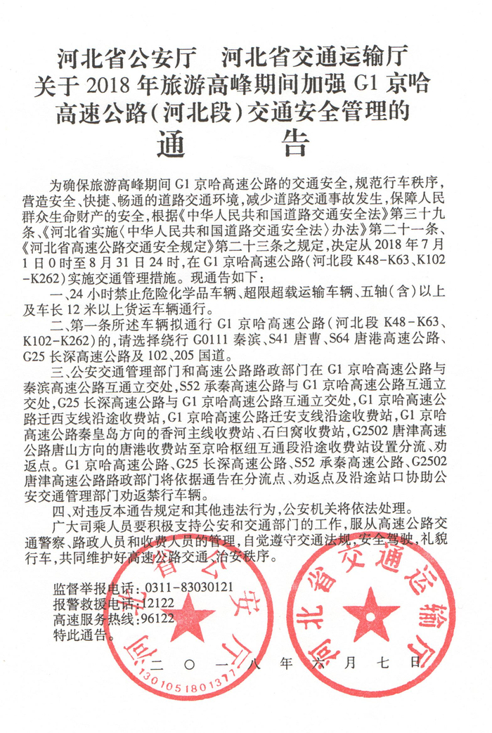 6月13日,澎湃新闻(www.thepaper.cn)记者从河北省公安厅高速交警总队获悉,为确保旅游高峰期间G1京哈高速公路的交通安全,规范行车秩序,营造安全、快捷、畅通的道路交通环境,减少道路交通事故发生,保障人民群众生命财产的安全,根据《中华人民共和国道路交通安全法》第三十九条、《河北省实施<中华人民共和国道路交通安全法>办法》第二十一条、《河北省高速公路交通安全规定》第二十三条之规定,决定从2018年7月1日0时至8月31日24时,在G1京哈高速公路(河北段K48-K63、K102-K262)实施交通管理措施。