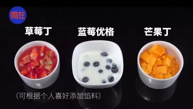 5. 备好草莓丁、蓝莓优格、芒果丁(可依据个人喜好添加馅料)。