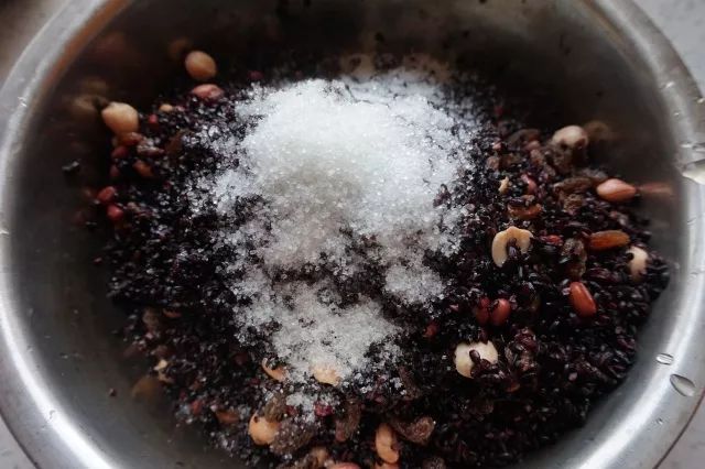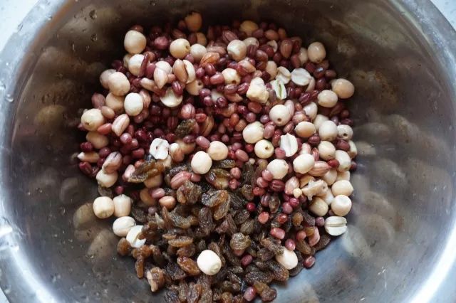1. 红豆、莲子、花生仁、紫糯米提前泡12小时以上,泡好后加入洗净的葡萄干。紫糯米需单独泡,其他食材可同泡。