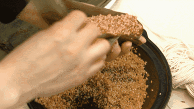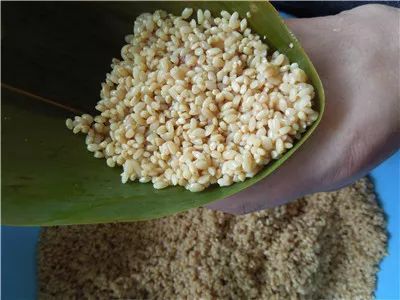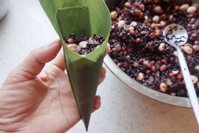 3. 包粽子:包粽子时粽叶光滑的那一面朝上,否则会粘住米;填入馅料时,需要捏紧粽叶,不到最后捆线时绝不放松!