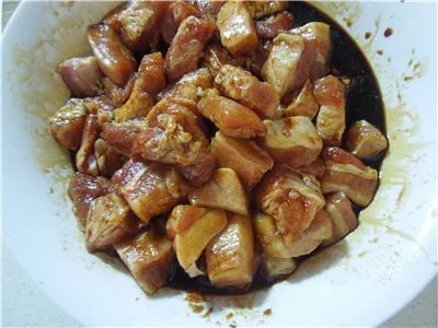 4. 用25毫升生抽、3毫升老抽、2克盐、少许糖拌入腌制1~2个小时入味。