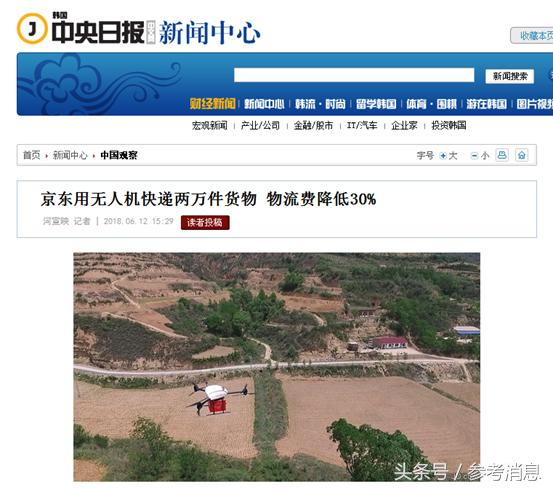 在文章中,《中央日报》还引用了英国经济专业杂志《经济学家》在6月9日的相关报道称,“京东集团的无人机负责向江苏省、山西省100多个村庄快递货物”,“迄今通过无人机发送的货物已超过2万件”。