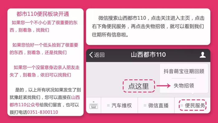 除了大家丢失的钥匙、公交卡、心爱的宠物都市110可以帮忙寻找以外,如果您有朋友家人不幸走失,也可以联系我们,便民热线0351-8300110,一直和你在一起。