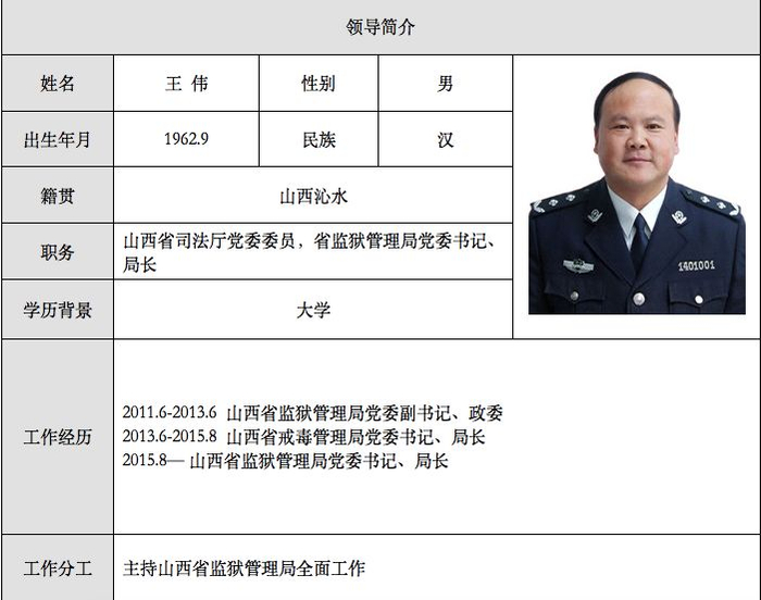 王伟落马的消息是昨晚21时16分被通报的,这位监狱管理局的一把手是“60后”,山西本地人,是在监狱系统内一步步成长起来的。