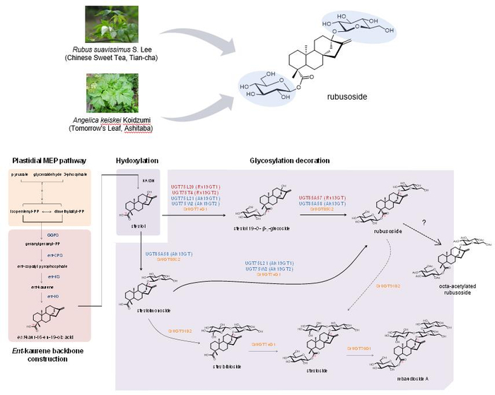 二萜类化合物是一类重要的植物源次生代谢产物,具有广泛的生理和药用活性。尽管二萜类化合物具有广泛的分布,但其糖基化修饰却非常罕见,自然界仅有极少数植物,如甜叶菊(S. rebaudiana)、甜叶悬钩子 (R. suavissimus)与明日叶(A. keiskei)等能生产糖基化的二萜类化合物。这些二萜糖苷在食品工业、药物开发中具有巨大的开发和应用前景。甜茶素(Rubusoside)即是其中的代表,它是一种稀有的糖基化贝壳杉烯型四环二萜类分子,主要来源于两种药食同源的植物——甜叶悬钩子和明日叶。其甜度约为蔗糖的60倍而热量仅仅为蔗糖的1/10,是一种理想的天然甜味剂。新近的报道表明,甜茶素是首个发现的可同时抑制人果糖转运蛋白GLUT5和葡萄糖转运蛋白GLUT1的小分子化合物,具有独特的药理活性。