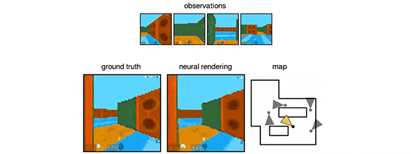 具体来说,这个名为生成查询网络(Generative Query Network, GQN)的系统分为两个部分:表示网络和生成网络。表示网络负责从2D样本图像中提取出一套用来表现场景的编码,而生成网络则可以输出该场景在新视角上的可能图像。在这个过程中,网络也会考虑到不确定因素,比如场景图像存在部分模糊。