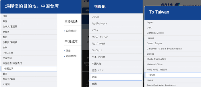 其次,韩亚航空和大韩航空,则是把中日韩各城市机场全部归纳在“东北亚”之下,各语种订票系统保持一致。而今年5月,韩亚航空在之前版本的订票系统中,还是将中日韩分开排列,并将台湾列于“中国大陆及港澳台”之下。韩国航空公司此次改动,似乎是为了规避“中国台湾”这一话题。