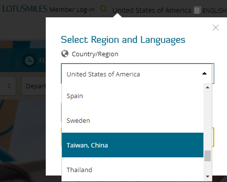 图为越南航空选择区域和语言列表