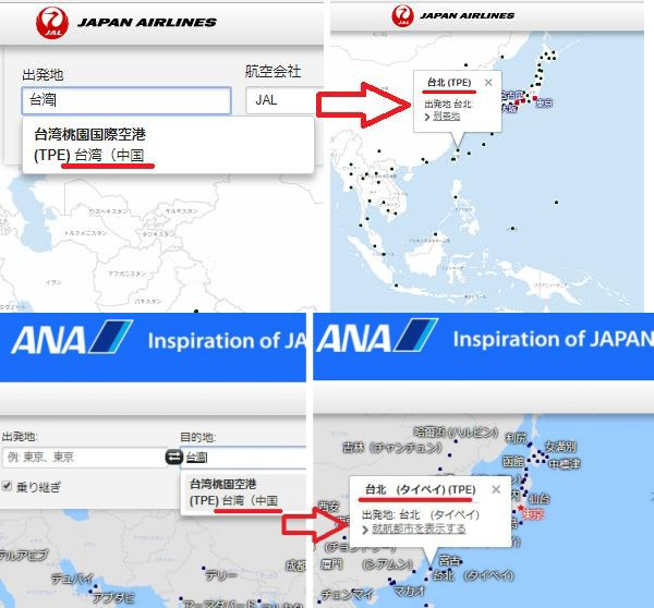 图为日航和全日空把“中国台湾”改回“台北”(来源:台媒)