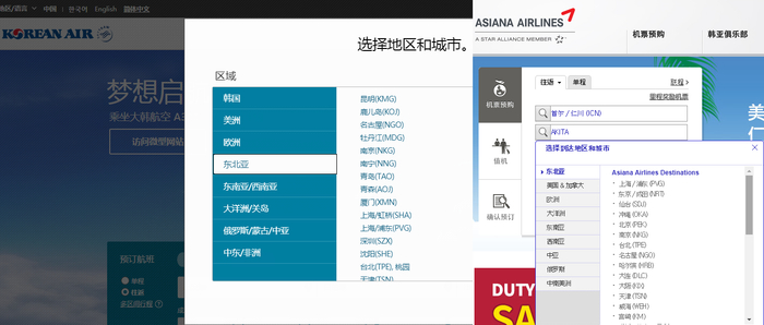 图为韩亚航空和大韩航空的订票页面。