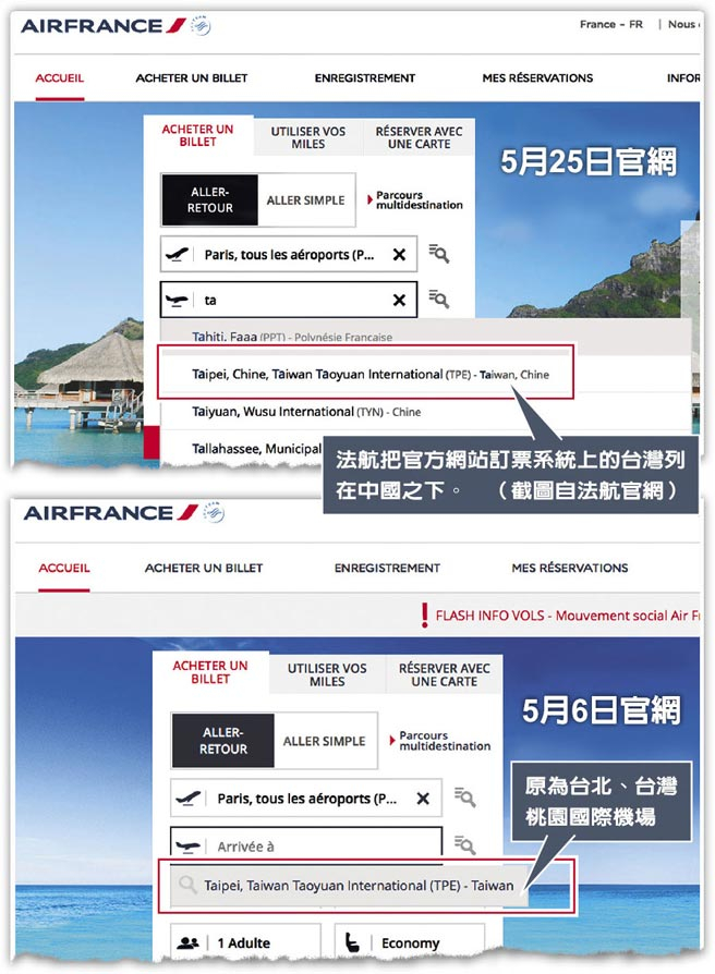 图为法航将“台湾”改为“中国台湾”(来源:中时电子报)