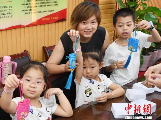 主办方将参加活动的50名3至16岁的少年儿童分为四个队,每个队指派一名该院义务人员指导家长及孩子制作香囊。
