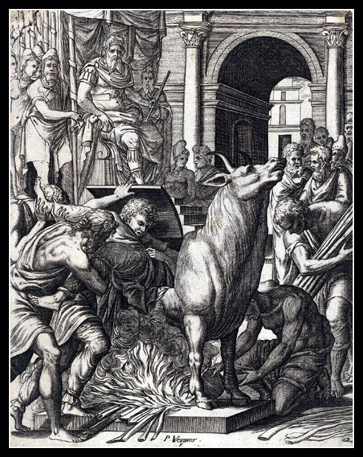 西西里有一座中空的铜牛像,每当祭祀时,祭司会将人牲塞进铜牛的肚子里,然后在外面点起火焰,将里面的人活活炙杀。铜牛内还有一套导管,可以将人的哀嚎声传到外面,转变成牛的叫声。这种祭祀方式又让人联想到了帕西淮钻进木牛肚子里和克里特公牛交媾的情形。