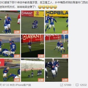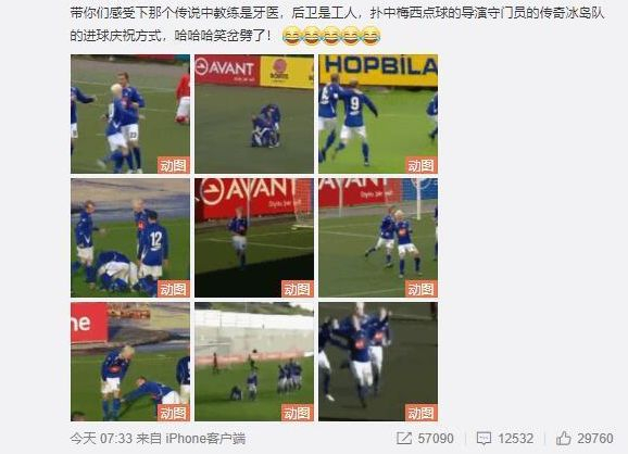 某些微博晒出了多张搞笑庆祝动作,并配文:“带你们感受下那个传说中教练是牙医,后卫是工人,扑中梅西点球的导演守门员的传奇冰岛队的进球庆祝方式,哈哈哈笑岔劈了!”对此转会市场网站管理员朱艺转发了该微博并辟谣称:这是冰岛俱乐部斯塔尔南,多年前的梗。和冰岛国家队是两回事。