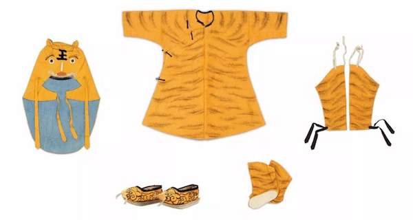 而虎为阳物,是百兽之长,能吞食鬼怪,可以辟邪。宋代开始人们就在端午节期间以艾蒿编织成虎形佩戴悬挂。故宫博物院现藏有同治皇帝幼年时的一套老虎衣,以轻薄的纱料制成,上画虎纹,应该就是同治皇帝在端午节期间所穿,家长把孩子扮成老虎,欲借虎驱邪,保佑孩子健康成长。如今端午节期间,以雄黄酒于孩童脑门上画“王”字,也是同样意思。