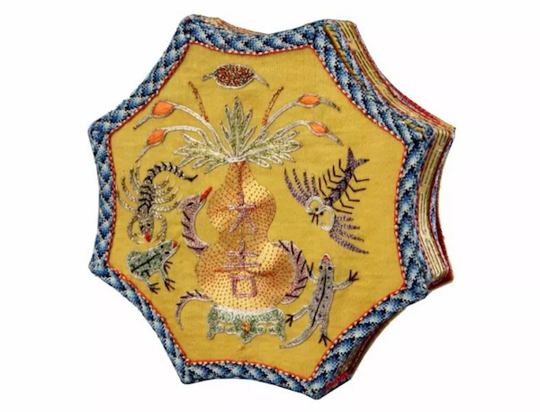 除了使用轻薄材料,宫中还会以各种节日纹饰装饰服装,其中以五时花、五毒、老虎为代表。所谓五时花,即盛开在端午期间的花卉,其中以蜀葵花、石榴花为典型。所谓五毒,是指端午之后开始频繁活动的五种毒虫,包括蛇、蝎子、蜈蚣、蟾蜍、壁虎等,事实上这些动物中有些并没有毒性,有些毒性不大,但在古人心中,他们都很危险。由于仲夏五月是恶月,蚊虫毒物滋生,邪气较重,古人便制作五毒图案,随身穿戴,以毒攻毒,据说可以免遭毒虫侵扰、驱散邪气。