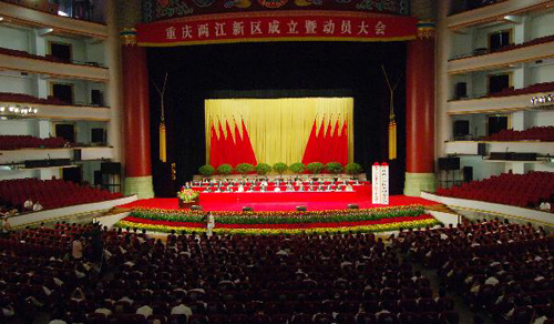 这是2010年6月18日,重庆两江新区成立暨动员大会在重庆市人民大礼堂举行,标志着两江新区正式成立。新华社记者陈诚摄