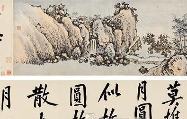 同时出现在朵云轩预展中的古代书画尚有明代沈周的书画合卷《有竹庄中秋赏月图》卷的书法部分即可见出,该卷全长11米有余,是沈周少见的巨制,画面描绘的是沈周在有竹庄的平安亭与友人浦汝正中秋饮酒赏月时的情景。平安亭中二人举杯对饮,皓月当空,小径蜿蜒,两山对峙中有飞瀑,其上所建楼阁即是有竹庄。沈周将元代文人画与“浙派”戴进等人风格兼收并蓄,创造了独具个人面目的雨点皴。通篇笔墨雄健老辣,清幽高旷,是典型沈周粗笔山水画,称为“粗沈”。