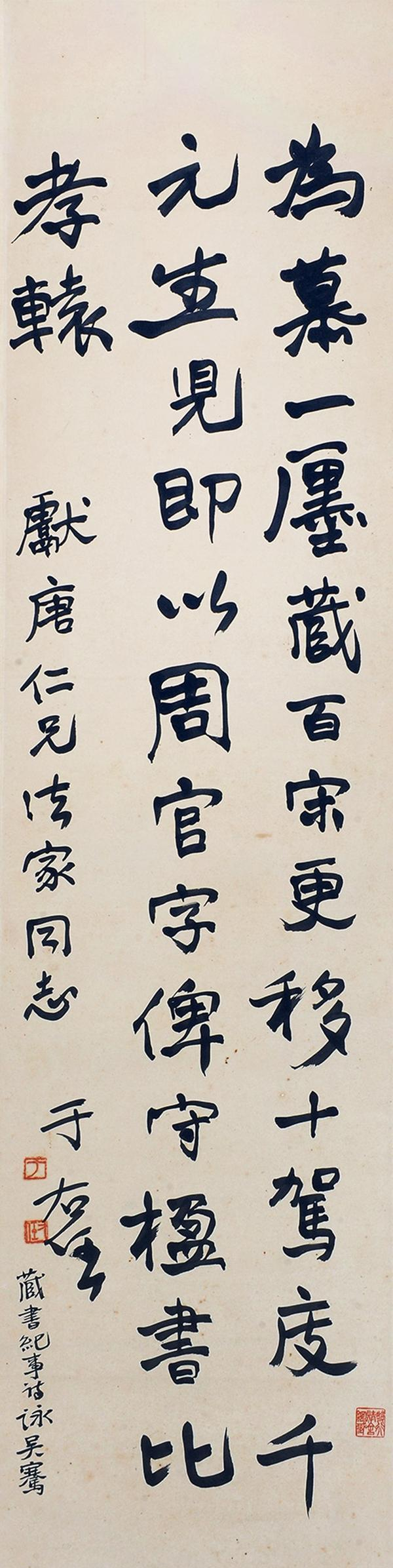 王献唐先生在学术研究上所取得的卓著成就,固然源于其一生勤奋治学,与其幼年和青年时期接受了良好的国学和西学教育和周围良师益友的影响有着密不可分的关系。自1929年掌山东省立图书馆后,因工作关系,结识了海内外大量的学者,并与丁惟汾、于右任、蔡元培、傅斯年、董作宾、陈梦家、富开森、高田忠周等国内外著名学者近300人有通信往来,交相论学,获益良多。郭沫若曾登门拜访并尊称这位小其十余岁的齐鲁学人为“王献老”。于右任不仅是一位文武兼备的书法大家,还酷爱金石,共同的爱好拉近了王献唐与于右任的交往,从王献唐后人处得知两位大学者之间的书信往来有百余封之多,可惜在文革期间付之一炬。所幸的是,于右任的两件书法作品居然得以幸存。