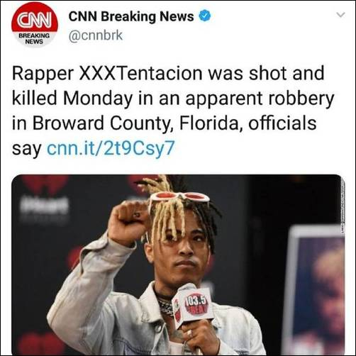 CNN18日报道称,XXXTentacion的尸体是在当地一家摩托车店外被发现的。佛州警方表示,18日下午3点51分左右,XXXTentacion在佛州南部、迈阿密北方的迪尔菲尔德海滩购物时,疑似遭到武装抢劫,在自己的宝马车上遭到枪击。