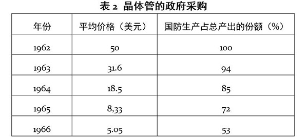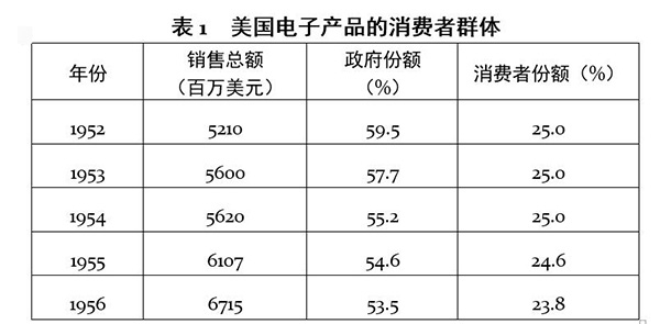 如表1所示,在1952年的时候,政府需求占了电子产业产出的近60%。大规模的政府需求有效拉动了美国电子产业的发展。