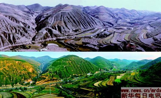 在卫星遥感图上清晰可见一条绿色的分界线,与行政边界相吻合,标志着“绿色延安”已经形成