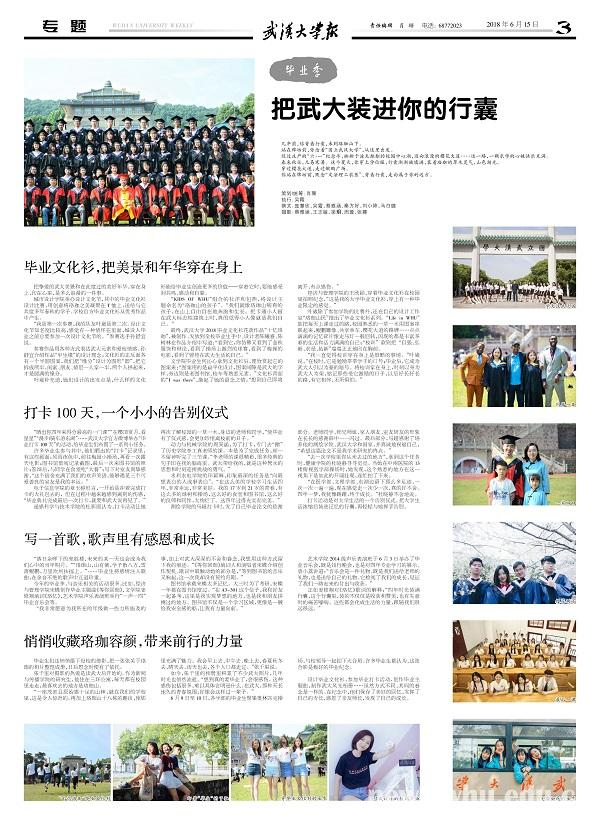 设计毕业文化衫,参加毕业打卡活动,创作毕业主题曲,制作武大风光相册……虽然方式不同,其间的眷念是一样的。在纪念中,他们保存了美好的回忆,发挥了自己的专长,感恩了亲友师长,发现了自己的成长。