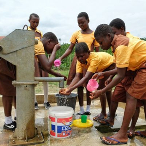 18日,加纳东部省古阿由兹村的小学生在课间休息时来到中国援建的水井打水、洗脸。(赵姝婷 摄)