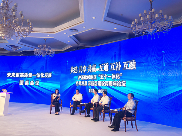 6月21日上午9点30分左右,沪浙毗邻地区“五个一体化”协同发展示范区建设两周年论坛在上海国际会议中心举行。论坛上总结了两年来上海枫泾镇与浙江嘉善两地在一体化发展中取得的成果,并达成了新的共识。