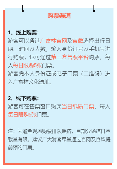 2、线下购票:游客可在售票窗口购买当日纸质门票,每人每日限购5张门票。