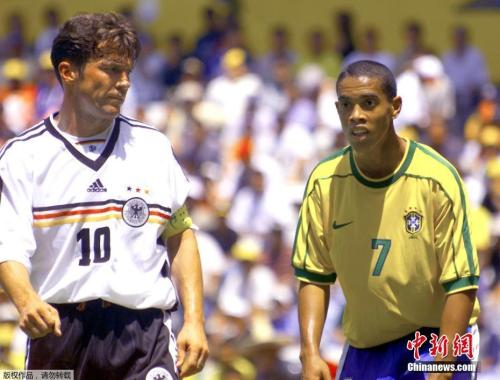 然而,德国队的厄运却不止于此。2002年的韩日世界杯决赛,德国战车遭遇到了拥有“3R组合”的巴西。双方在上半场互交白卷。但下半场风云突变:第67分钟,大罗前场突破被断,但他积极反抢将球分给了里瓦尔多。