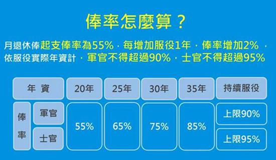 月退休俸起支俸率为55%,每增加服役1年,俸率增加2%,依服役实际年资计,军官不得超过90%,士官不得超过95%。